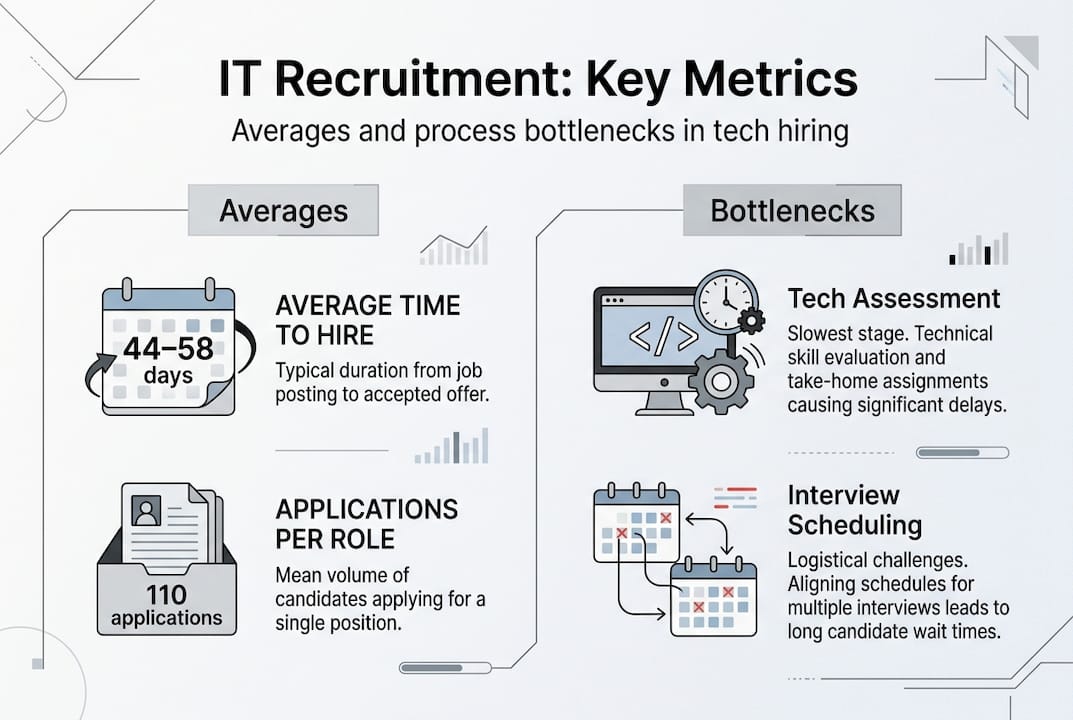 The typical tech hire takes 48 days to fill, which is 26% slower than the cross-industry average. If you've ever felt like your job application disappeared into a black hole, you're not imagining things. IT recruitment is genuinely more complex, slower, and more competitive than most people expect. Specialized roles, evolving tech stacks, and multi-stage interview processes all add friction that general hiring doesn't face. This guide breaks down how IT recruitment actually works, what slows it down, and what you can do to navigate it smarter.