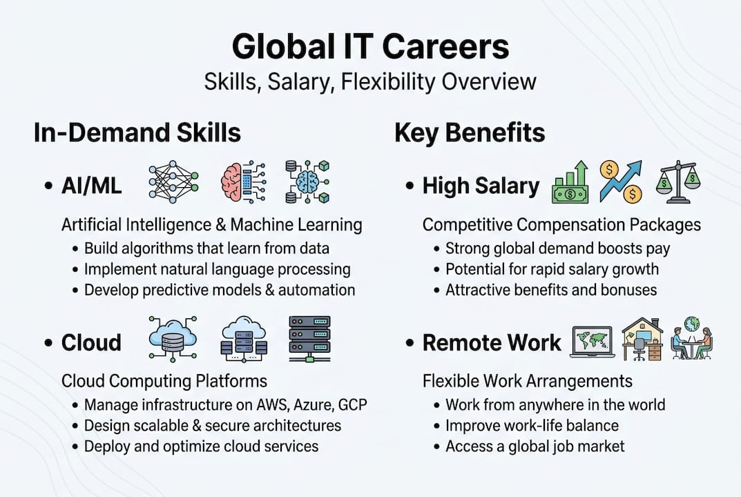 - Global IT jobs offer high salaries and diverse opportunities due to international talent shortages.